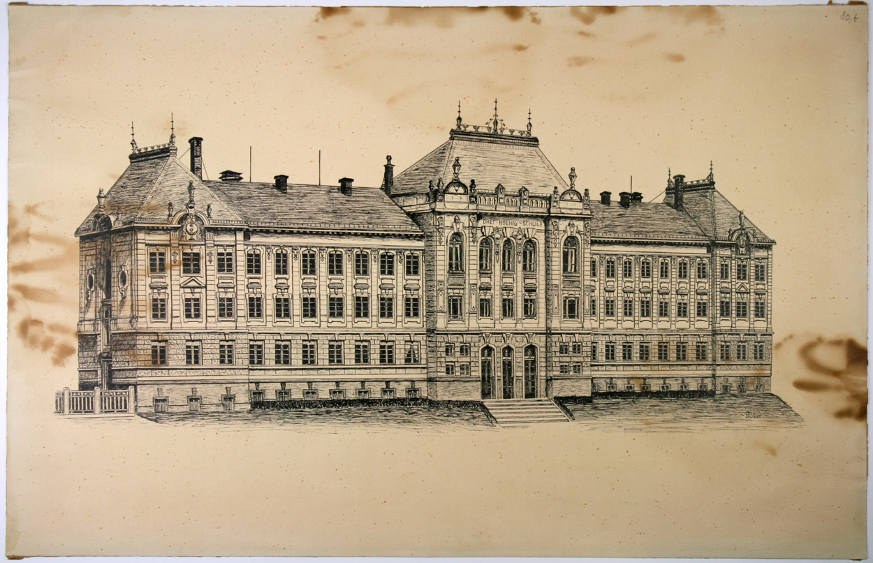 Feder in Schwarz auf Velin. Ca. 39 x 61 cm. Signiert unten rechts: Röller. - Das Schulgebäude wurde nach Plänen des Architekten Bruno Adam 1892/93 in der damaligen