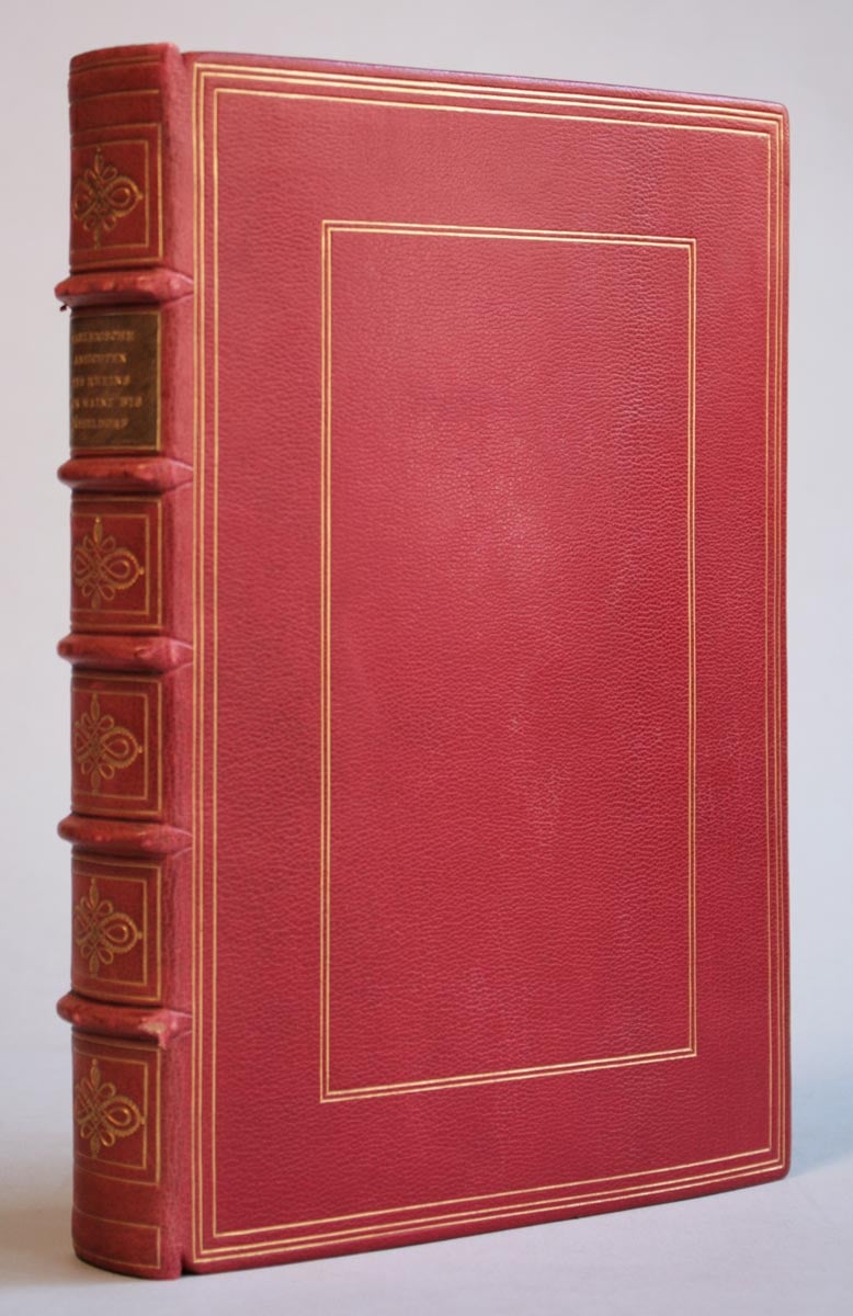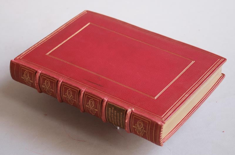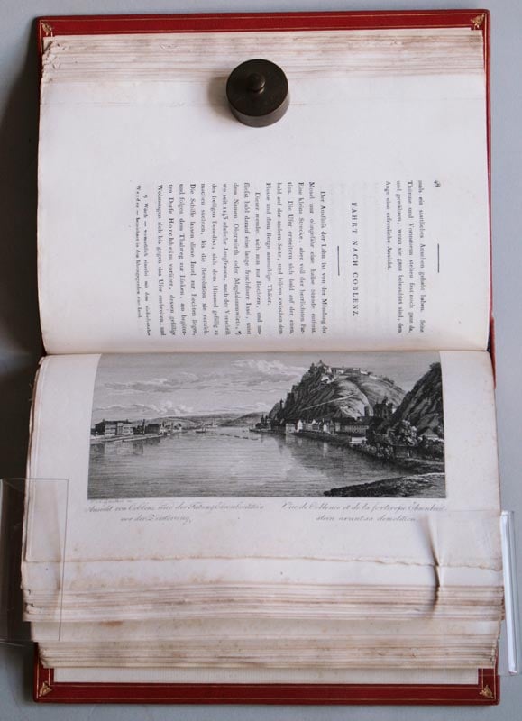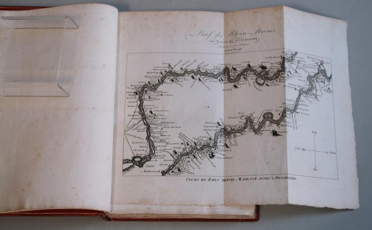 Mahlerische Ansichten des Rheins von Mainz bis Düsseldorf. Mit 32 nach der Natur von Schütz aufgenommenen und von Günther gestochenen Kupfern, und einer Karte. Frankfurt am Mayn, Friedrich Wilmans, 1806. 24 x 17 cm. Roter, signierter Lederband von Demeter, Hellerau mit goldgeprägten Fileten, Rückenverzierung und Rückenschild. - Lieferung in 3 Heften mit eingebundenen Titelblättern. (Z3671)