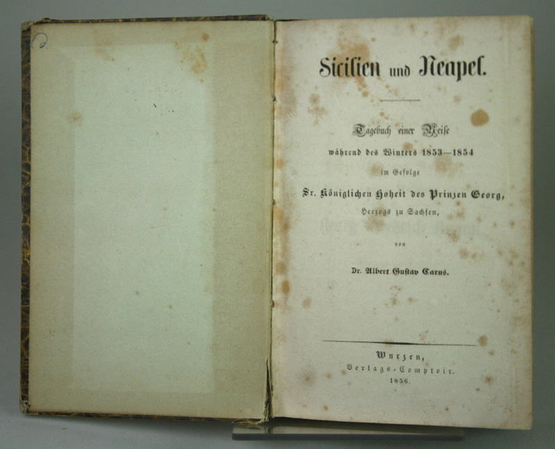 Sicilien und Neapel. Tagebuch einer Reise während des Winters 1853-1854 im Gefolge Sr. Königlichen Hoheit des Prinzen Georg, Herzogs zu Sachsen, von Albert Gustav Carus. Wurzen, Verlags-Comtoir, 1856. VIII, 484 S. 18 x 12,5 cm. Marmorierter Pappband d. Zt. - Seltene, einzig erschienene Ausgabe. - Einband stärker beschabt und bestoßen, Rücken mit Fehlstellen, Papier durchgehend stockfleckig. (Z2744)