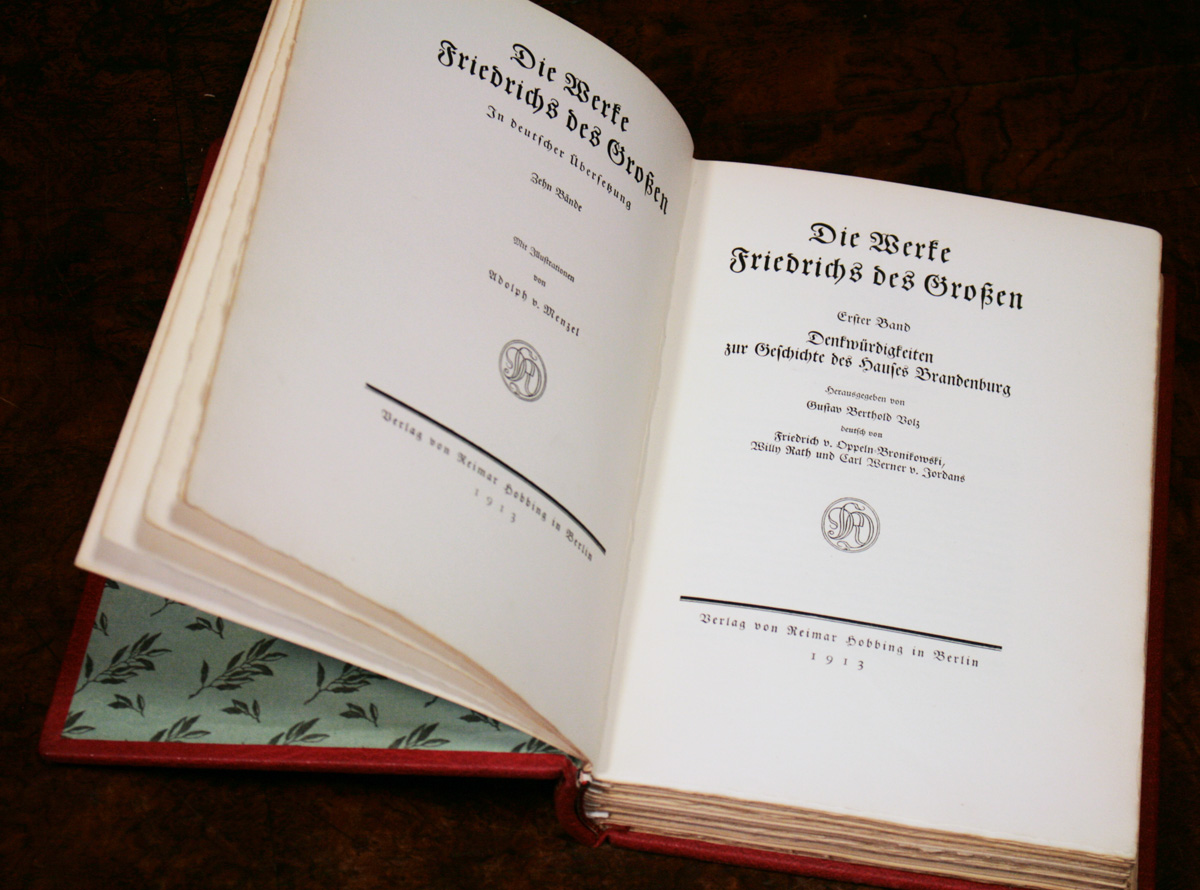 Die Werke Friedrichs des Großen. In deutscher Übersetzung. Herausgegeben von G. B. Voltz. Mit Illustrationen von Adolph von Menzel u. a. 10 Bände. Berlin, Hobbing, 1913-1914. 4°. Rote OMaroquinbände mit reicher Goldprägung, RSchild und Kopfgoldschnitt. - Eins von 440 Exemplaren der Luxusausgabe auf handgeschöpftem Bütten in prachtvollen Handeinbänden. Die Ausgabe erschien aus Anlass des 25jährigen Thronjubiläums Kaiser Wilhelm II. und des 200jährigen Geburtstages Friedrich des Großen. (Z4620)