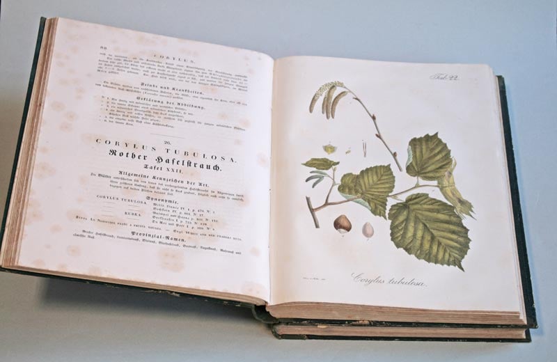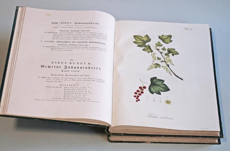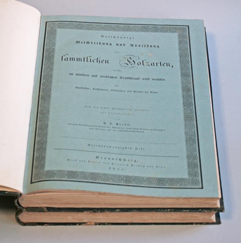Vollständige Beschreibung und Abbildung der sämmtlichen Holzarten, welche im mittlern und nördlichen Deutschland wild wachsen. Für Gutsbesitzer, Forstmänner, Oekonomen und Freunde der Natur ... von F. L. Krebs. 2 Bände (alles Erschienene). Braunschweig, Friedrich Vieweg, 1826. VIII, 460 S. Mit 145 Tafeln (kolorierte Lithographien). 37 x 28 cm. Etwas spätere Halbleinenbände mit goldgeprägtem RTitel. - Erschienen als Lieferung in 25 Heften. Im 2. Band ist das Deckblatt der Verlagsbroschüre des 23. Heftes vorn mit eingebunden. (Z680)