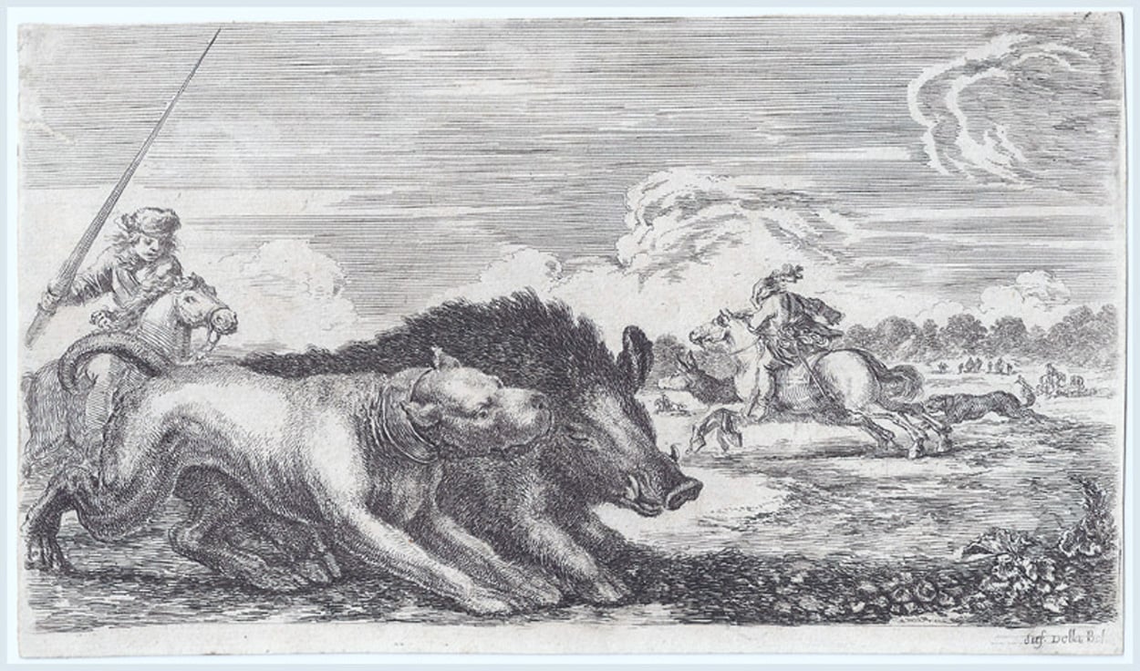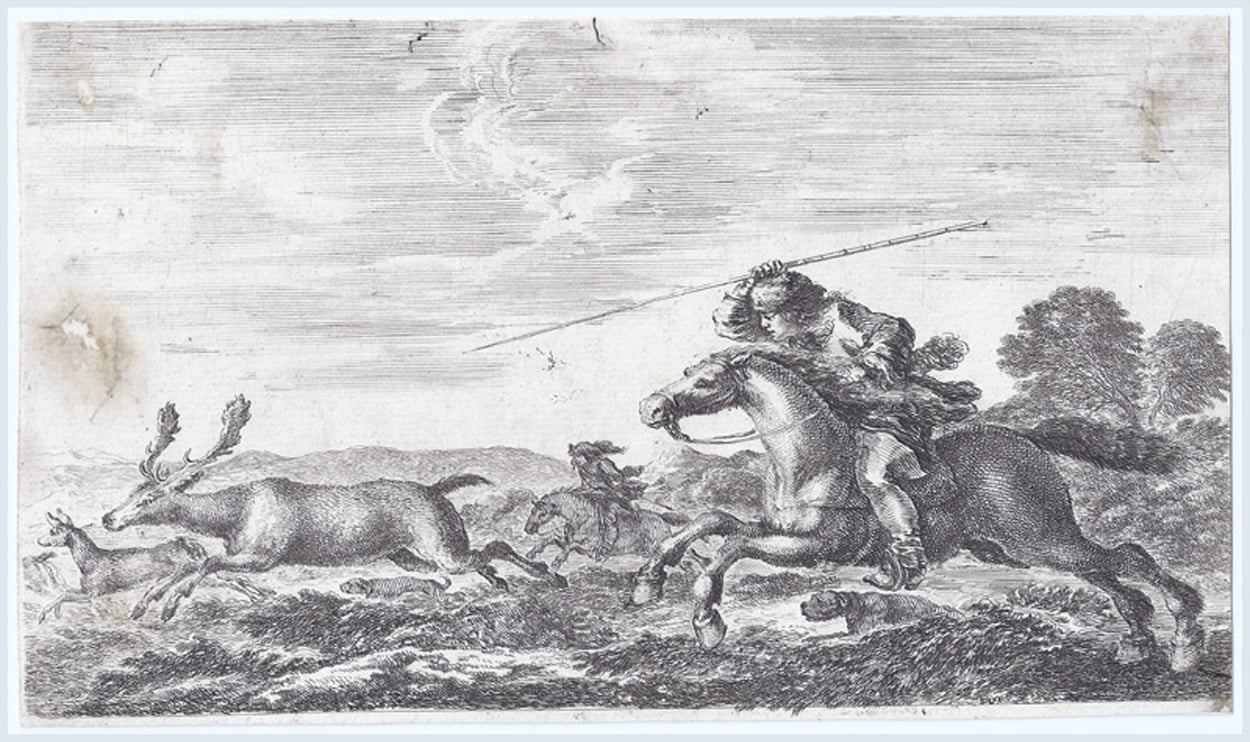 Jagdszene mit Reitern, Jagdhund und Wildschein / Jagdszene mit Reitern und Hirschen