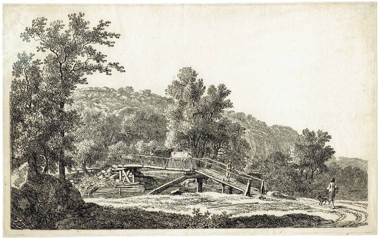 Flusslandschaft mit einer Holzbrücke und einer bewaldeten Hügelkette im Hintergrund, bei Hainsbach im Plauenschen Grund (Zeichenschule, 2. Teil)