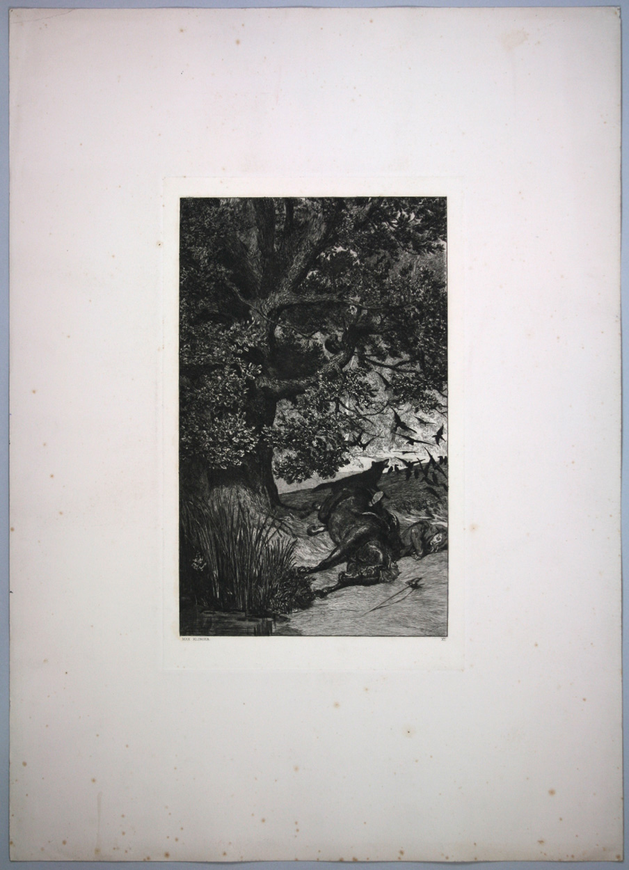 Radierung auf franz. China, auf Kupferdruckkarton. 36,5 x 23 cm (Platte). Ca. 63 x 45 (Blatt). Unter der Einfassungslinie links signiert: MAX KLINGER, rechts röm. beziffert, verso mittig Stempel der Kunsthandlung Ernst Arnold, Dresden. Werkverzeichnis: Singer S. 24 ff. - Karton stockfleckig.