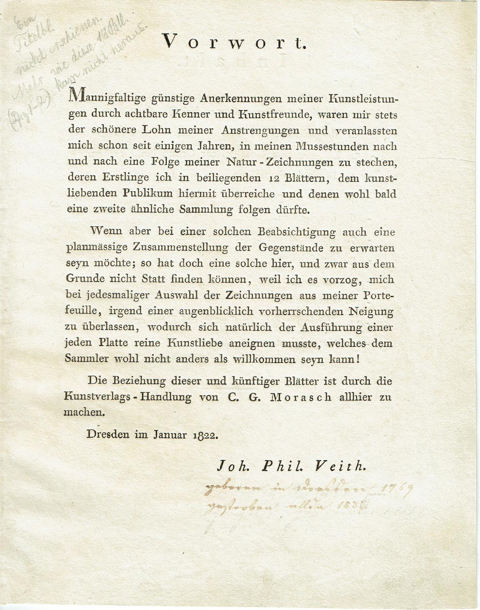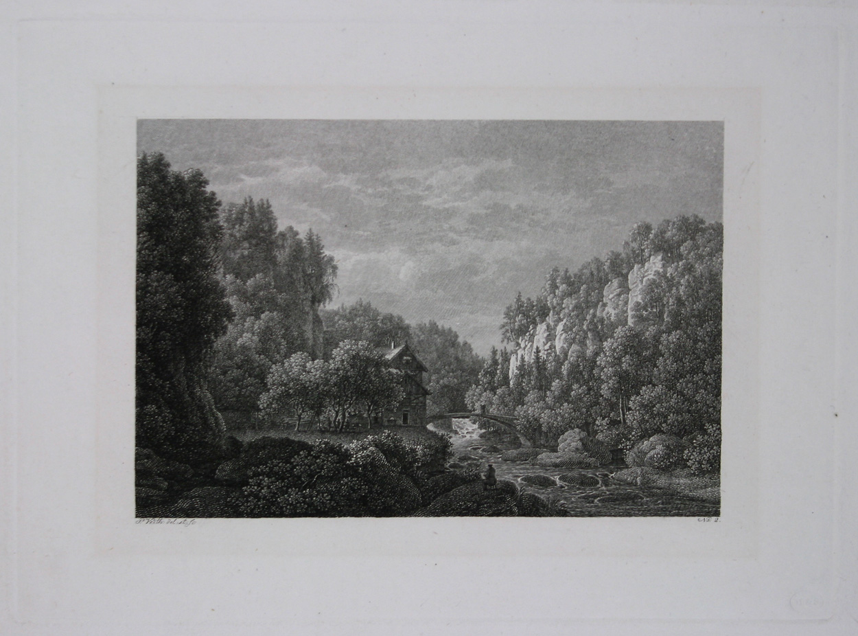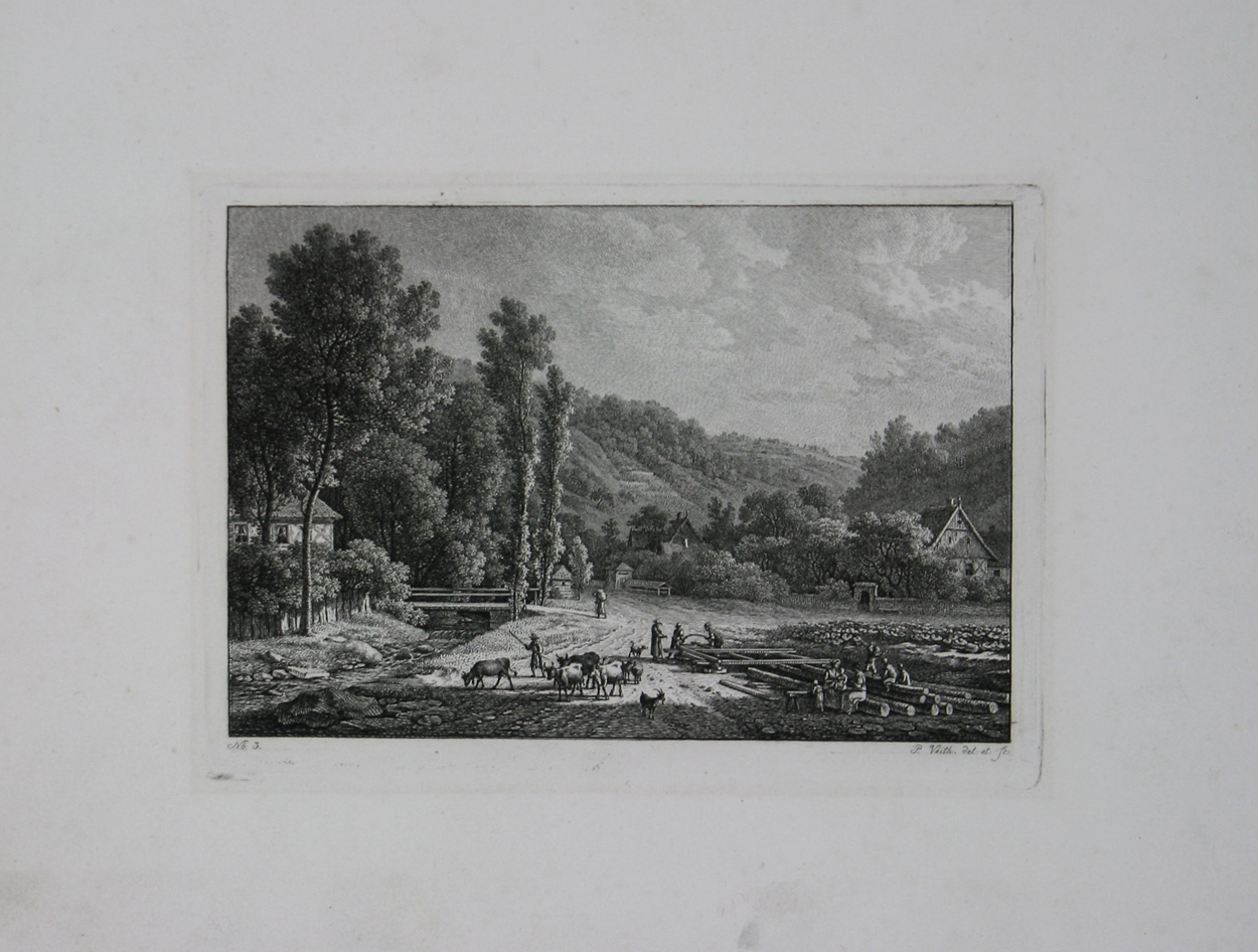 Erste Ausgabe der von Veith gezeichneten und radierten 18 Landschaftsblätter. Diese erschien ohne Titelblatt in zwei Lieferungen. Im Jahr 1839 brachte der Verlag die begehrten Ansichten als vollständige Sammlung mit fortlaufender Nummerierung erneut heraus.