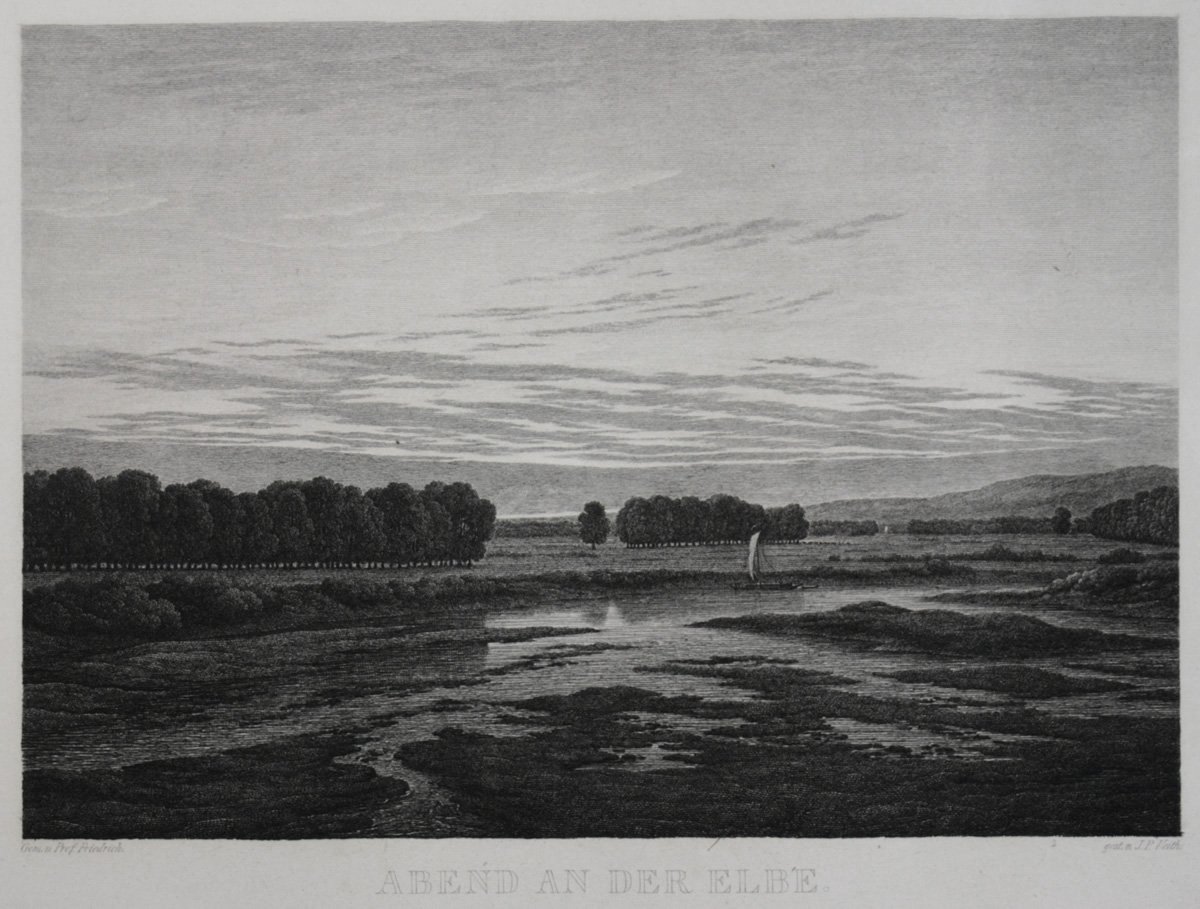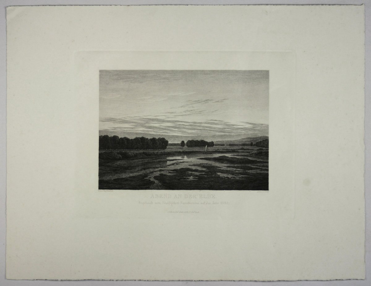 Kupferstich. 15,5 x 22,3 cm (Darstellung). 36 x 47,5 cm (Blatt). Mittig in der Platte unterhalb der Darstellung bezeichnet: Abend an der Elbe / Angekauft vom Sächsischen Kunstvereine auf das Jahr 1832, u. l.: Gem. v. Prof. Friedrich, u. r.: gest. v. J. P. Veith. (Z4223)