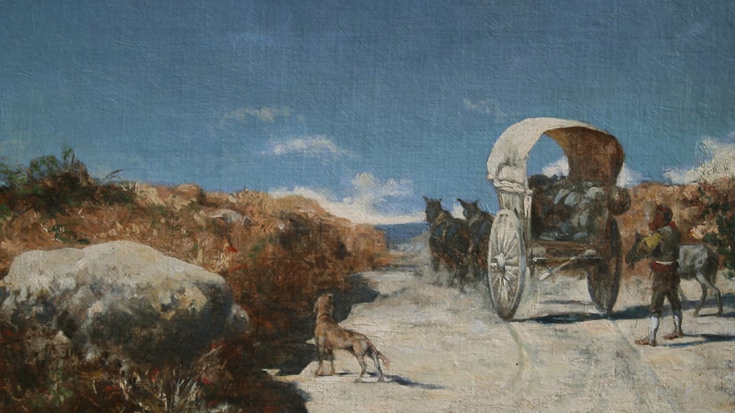 Blick von einer Anhöhe mit rastender Viehherde in weite Gebirgslandschaft, 1860