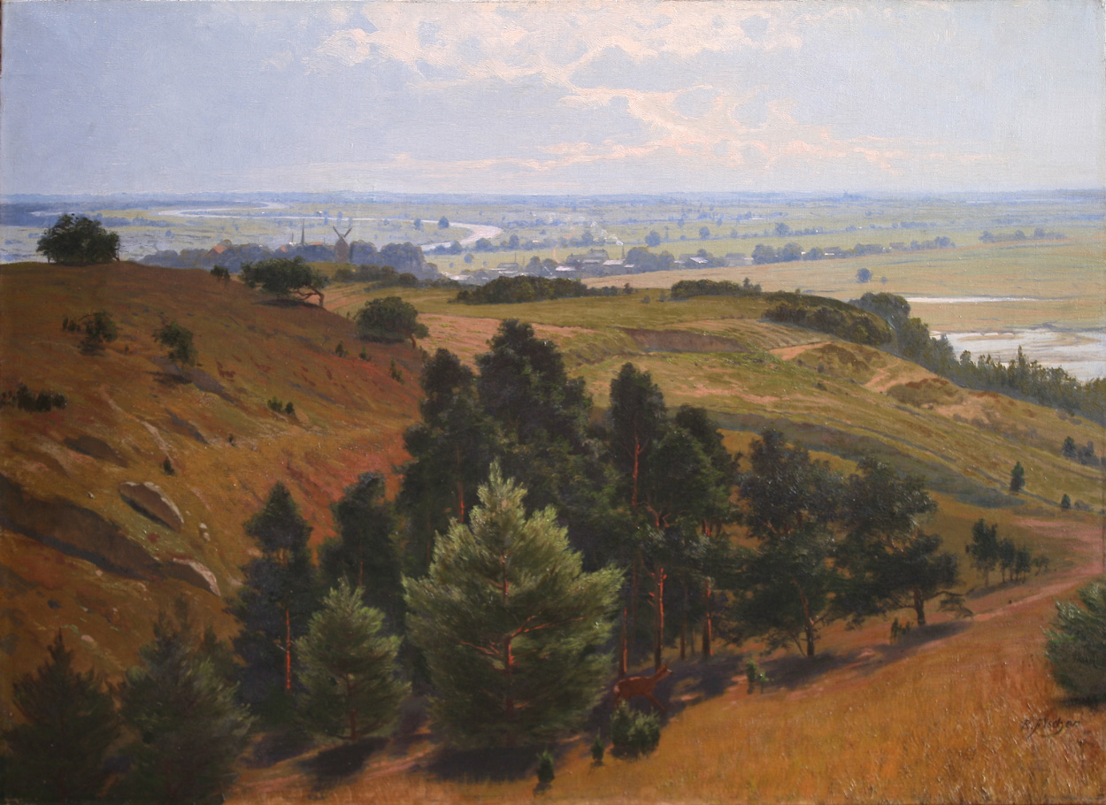 Weite Flusslandschaft (Oderbruch?), im Hintergrund eine Ortschaft, Blick auf Kirchturm und Windmühle, um 1870