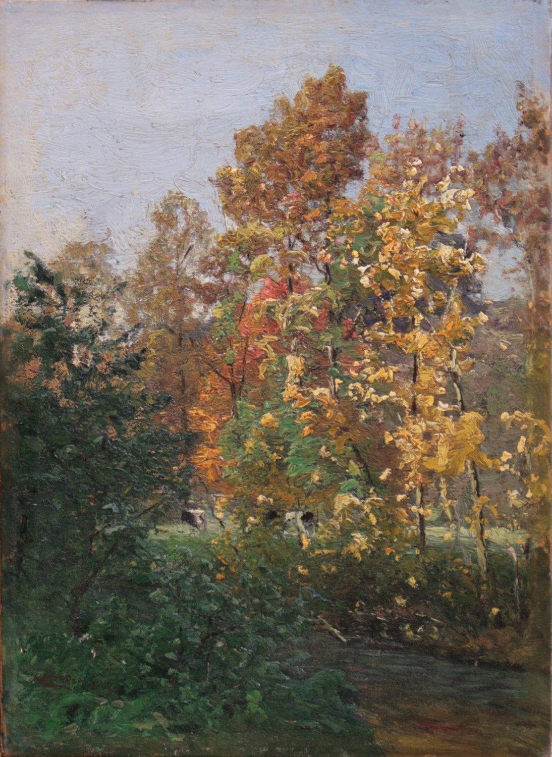 Herbststimmung (Bachlauf im Herbst, im Hintergrund weidende Kühe)