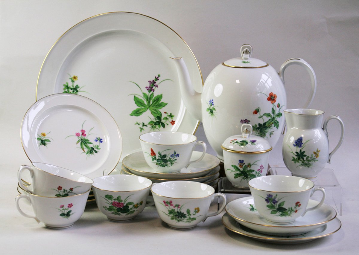 Porzellanmanufaktur Meissen, nach 1934. Formentwurf von Paul Börner um 1930, Dekorentwurf von Arthur Findeisen um 1955. Farbige Aufglasurmalerei, Goldstaffage. 22 Teile. Schwertermarke, 2 Schleifstriche.
