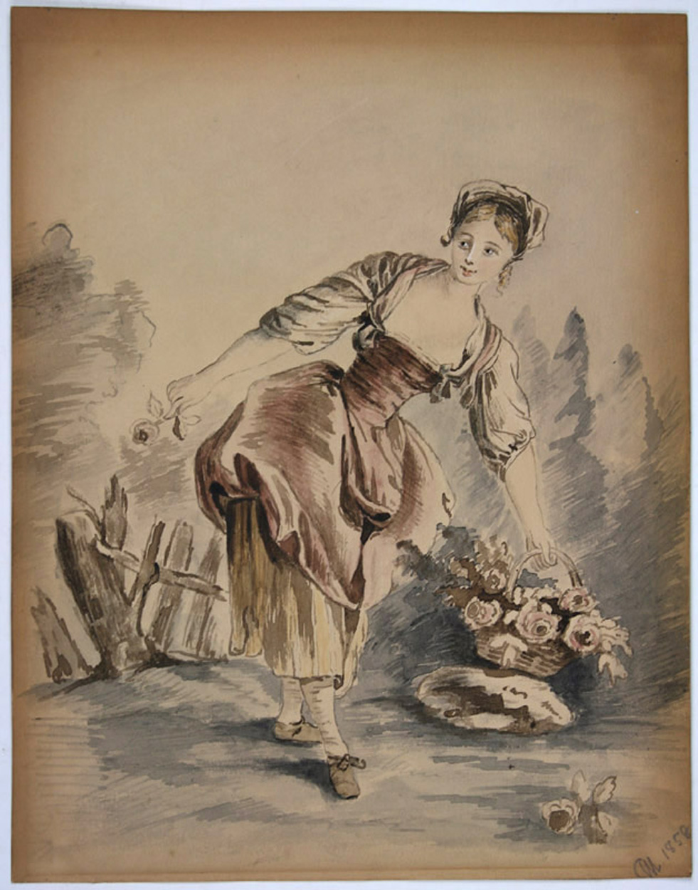 Feder in Braun, aquarelliert auf bräunlichem Papier. 28,6 x 22,4 cm. Unten rechts undeutlich monogrammiert und datiert: 1858.