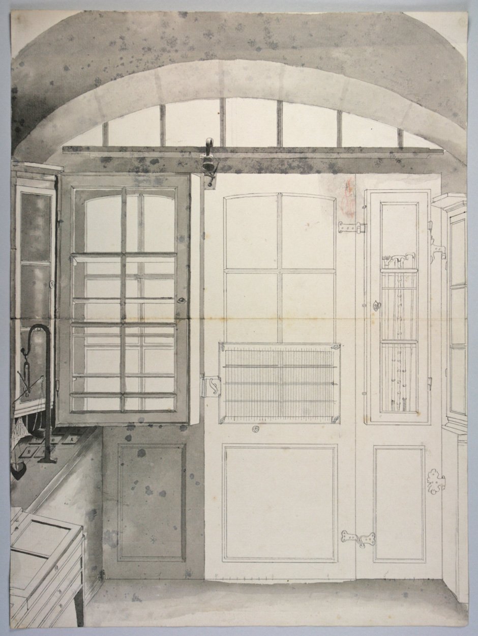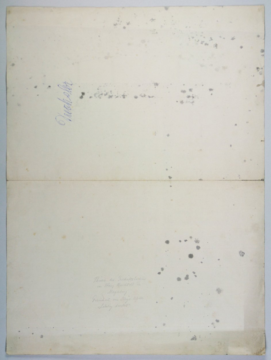 Feder in Grau, grau laviert auf Bütten. 47,3 x 35 cm. Rückseitig mit Bleistift bezeichnet: "Thüre des Geschäftladens von Franz Berchtold in Magdeburg gezeichnet von