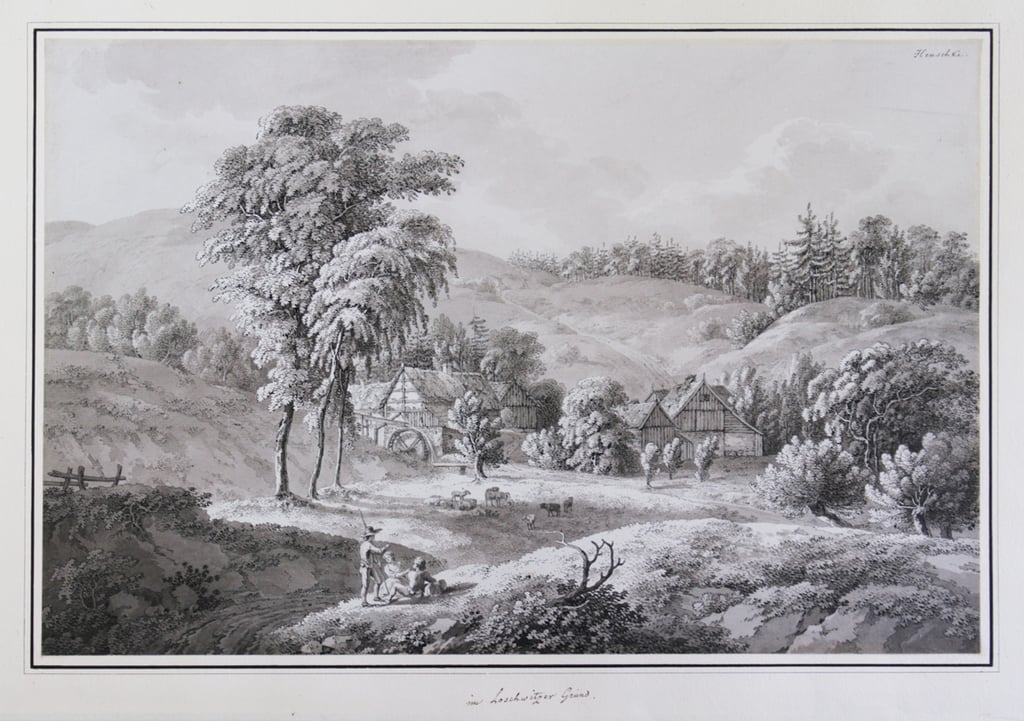 Feder in Schwarz, grau laviert auf Bütten. 36,2 x 51,7 cm. Oben rechts signiert "Hensch(e)ke". (K19)