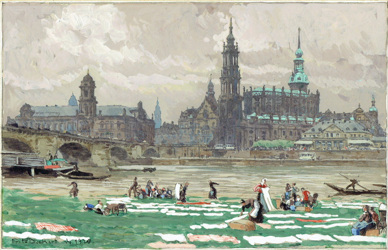 Frauen bei der Wäschebleiche am Neustädter Elbufer nahe der Augustusbrücke in Dresden, 1920