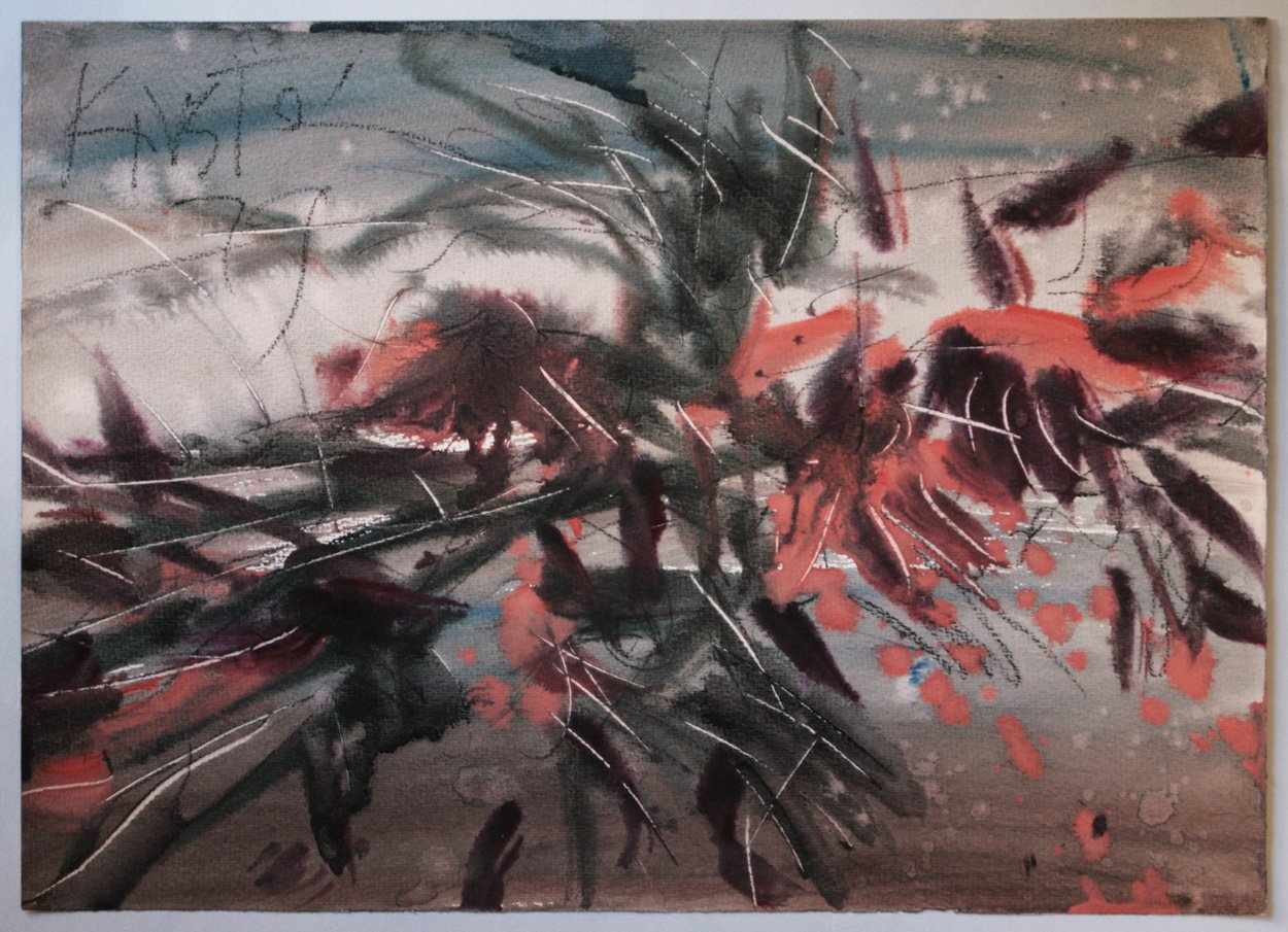 Kohlestift/Aquarell auf festem Papier. 37 x 51 cm. Oben links signiert, datiert: Kirstein 79, verso mit Bleistift bezeichnet: Schmidt-Kirstein 1979 "Verwelkter
